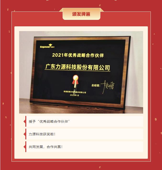 精誠(chéng)合作,共創(chuàng)共贏丨力源科技榮獲珠海英搏爾“2021年度優(yōu)秀戰(zhàn)略合作伙伴”